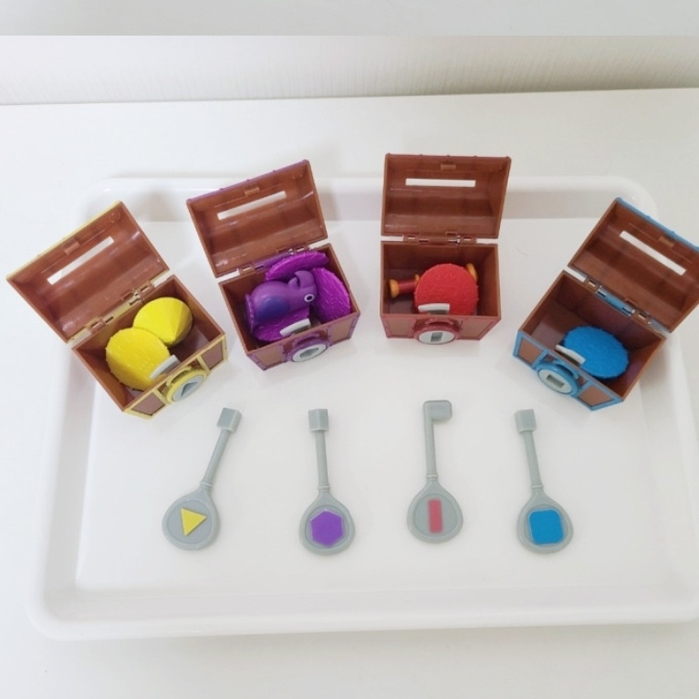 이건 아기랑 보물찾기 놀이를 하고 싶어서 충동 구매한 아이템인데 아이가 생각보다는 흥미가 없다. 보물상자에 열쇠를 끼어 넣으면 안에 각각 다른 색의 보물이 들어 있다. 맞추는 열쇠는 모양이 달라, 맞는 보물상자를 열어야 들어가기 때문에 아기 지능발달이나 소근육 발달에 좋을 것 같다.