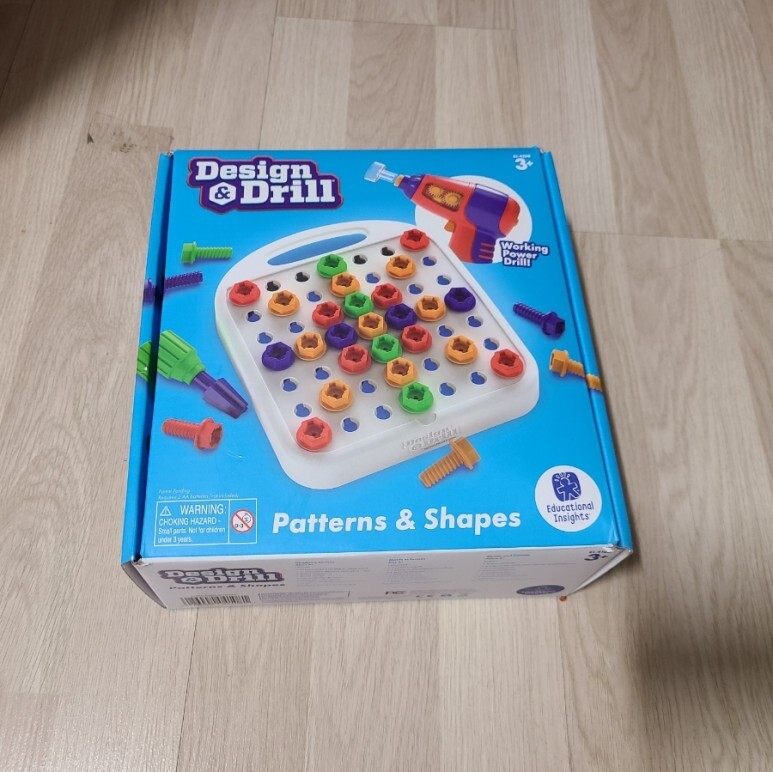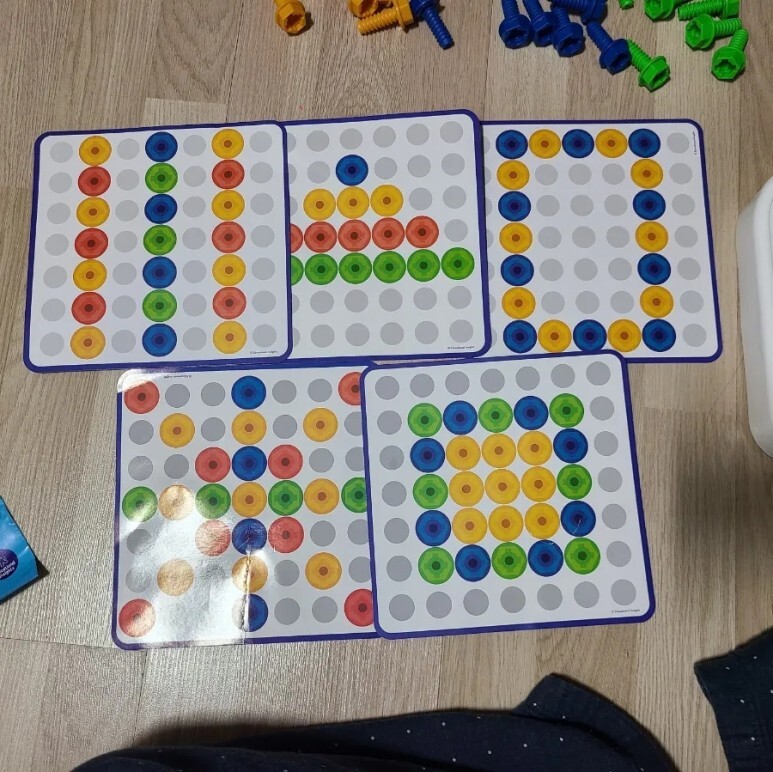 내가 구매한건 패턴활동 세트인데 구성은 이렇다. 드릴을 박을 수 있는 보드와 함께 형형색색의 볼트, 그리고 따라해 볼 수 있는 활동지 패턴이 10개 들어있다.