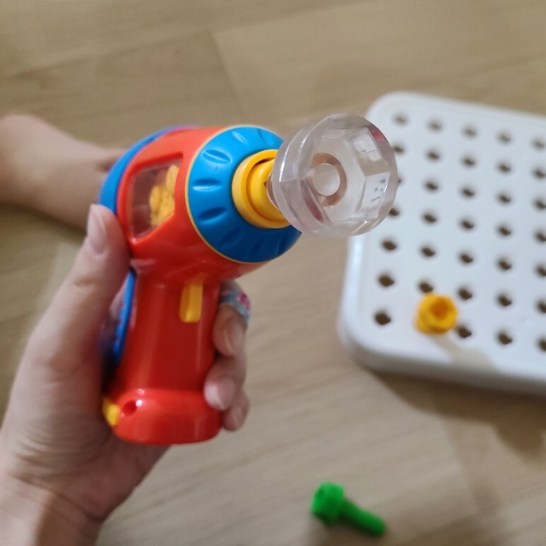 드릴 또한 뽀족한 타입이 아니라 이렇게 음각으로 들어가는 구조라 내가 본 드릴 장난감 중 제일 안전한 구조로 되어 있다. 총 또한 아이들이 많이 가지고노는 물총과 동일한 구조라 아이에게 알려주지 않아도 스스로 잡는 법을 알더라.