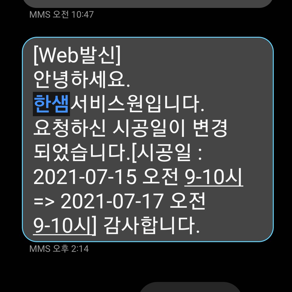 저희는 중간에 시공일 변경도 한번 했었는데, 시공일 변경 후 문자로 한번 더 정확하게 알려주더라고요.